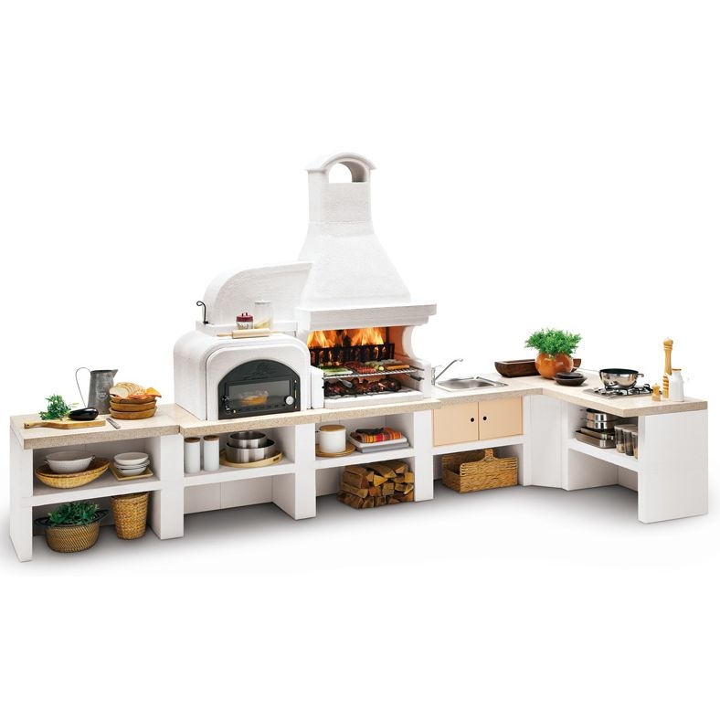 Выполнена из совместимых модулей. Столешница из полированного камня Marmotech. Основания всех модулей имеют заднюю стенку. Стальная решетка для дров и решетка из нержавеющей стали 76х40 с бакелитовыми ручками. Общие размеры: 450х85х218 см.