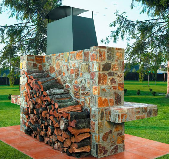 Четырехсторонняя барбекю из сланца Nicorella несимметричного с цементным швом. Топка и центральная плита из огнеупорного кирпича толщиной 5 см, кладка лесенкой. Со встроенной решеткой для жарки с направляющими. Боковая колонна, короб, колпак, раковина, слив и панель из черной нержавеющей стали.