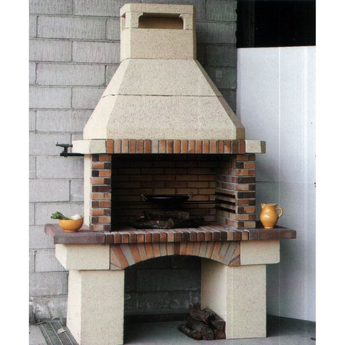 Барбекю с возможностью приготовления паэльи, из прессованной каменной крошки кремового цвета. Плиты, внешняя консоль и топка из огнеупорного кирпича.