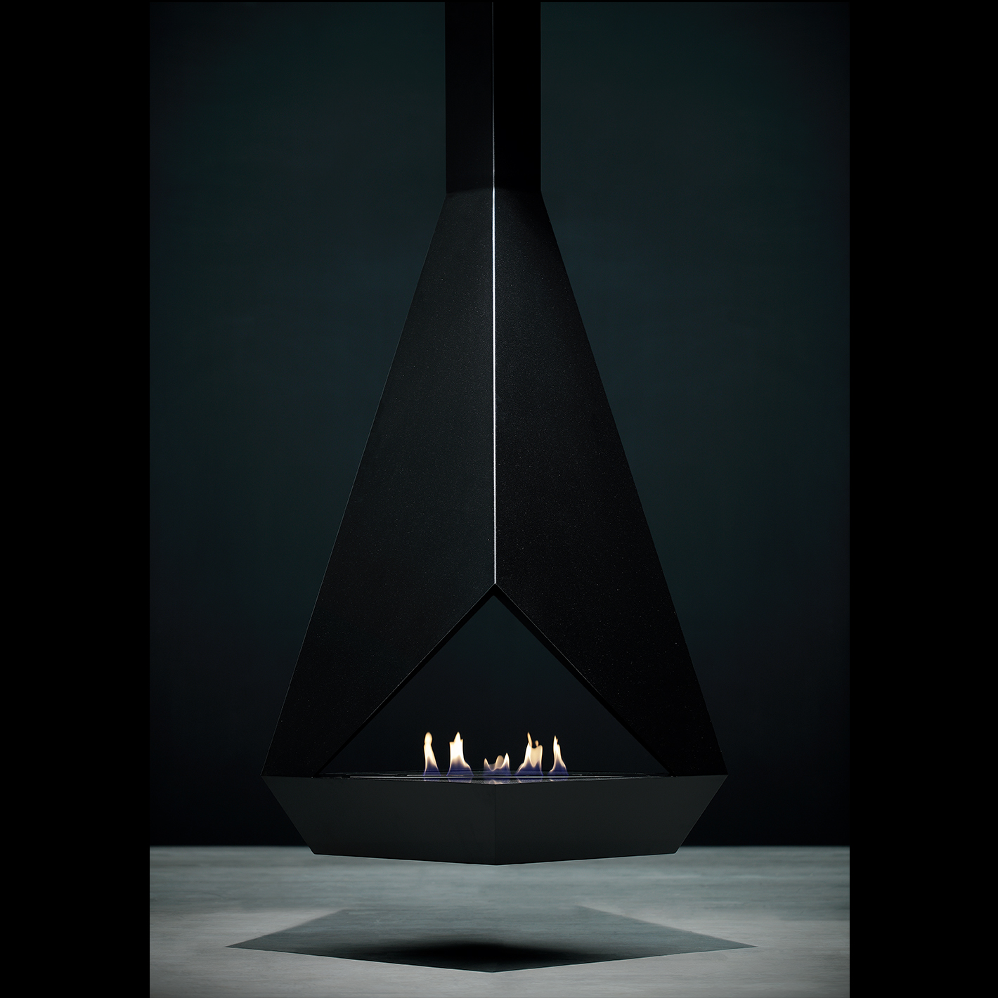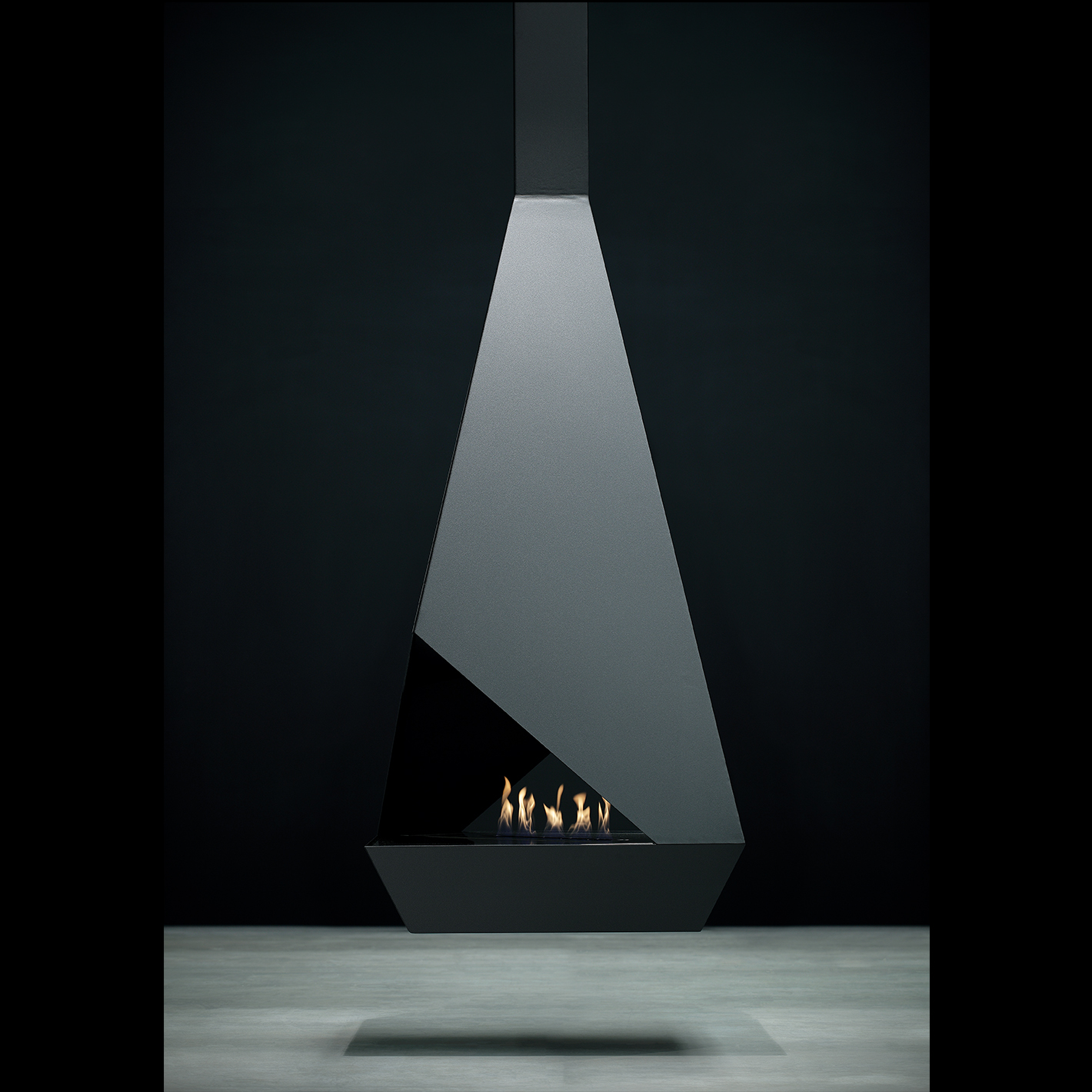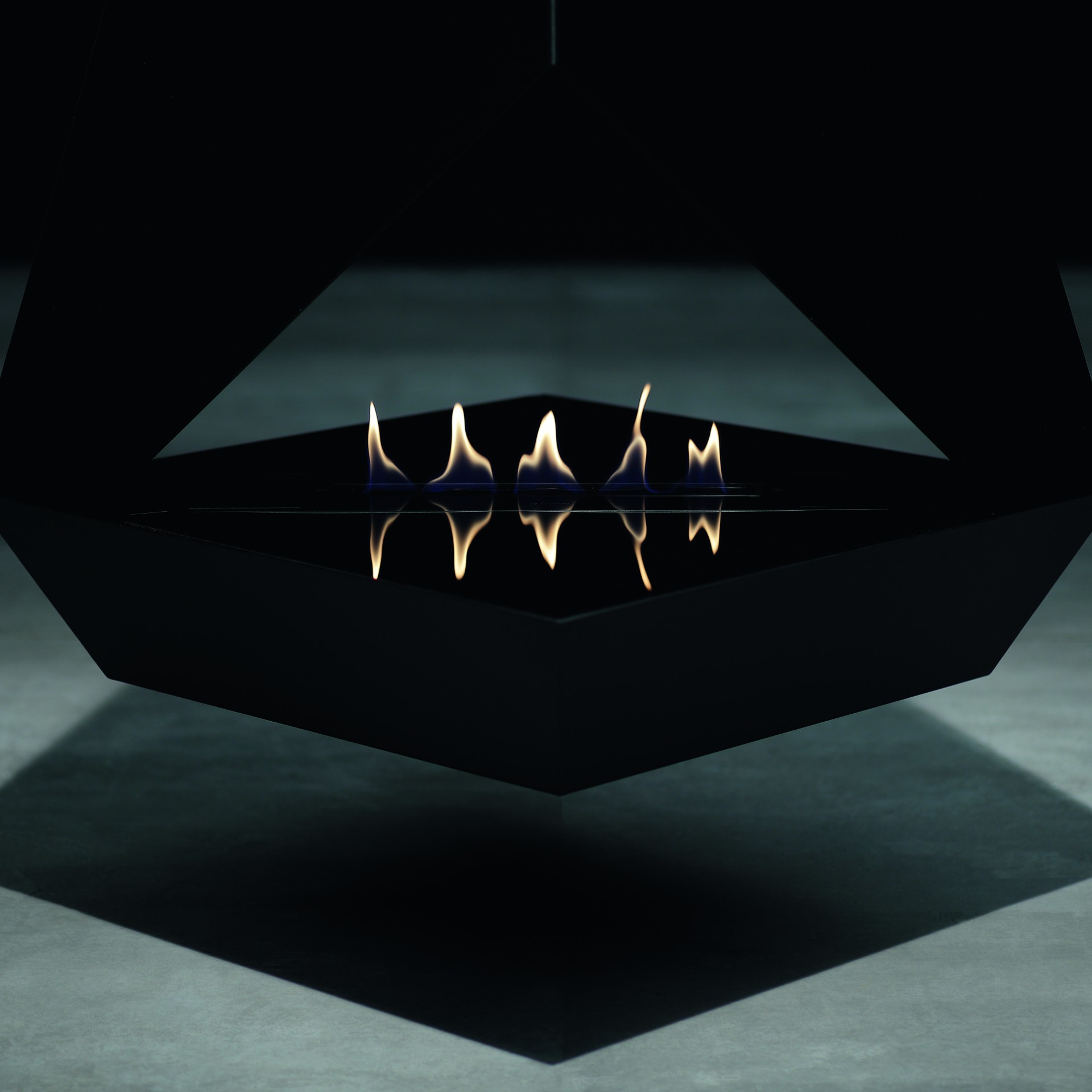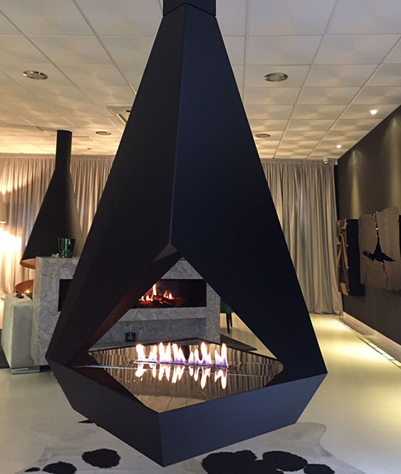 - Все смешалось в дизайне этого подвесного двухстороннего биокамина: плоскости в виде треугольников, трапеций, прямоугольников. Сквозной взгляд через пламя камина делает пространство вокруг таинственным и загадочным.
