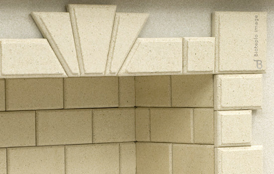 Модель выполнена кладкой из небольших по размеру камней шероховатой текстуры. Камни изготавливается из специально обработанного материала природного происхождения, обладающего высокими теплоизоляционными свойствами и огнеупорными показателями — вермикулита.
