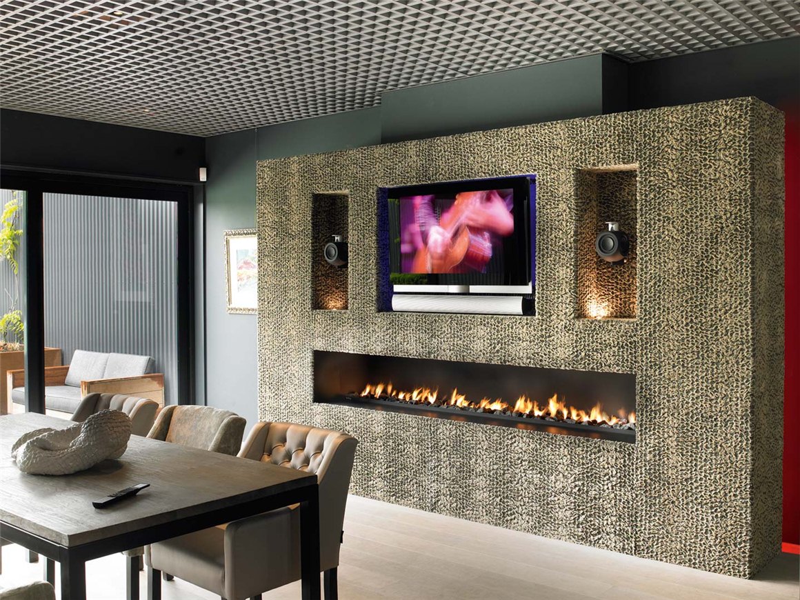- Отличается большими формами – очаг удлиненной конструкции спрятан в стене. Его горизонтальная вытянутая форма по всей его длине представляет потрясающие по красоте язычки пламени, которые сверкают по одному вашему желанию.
