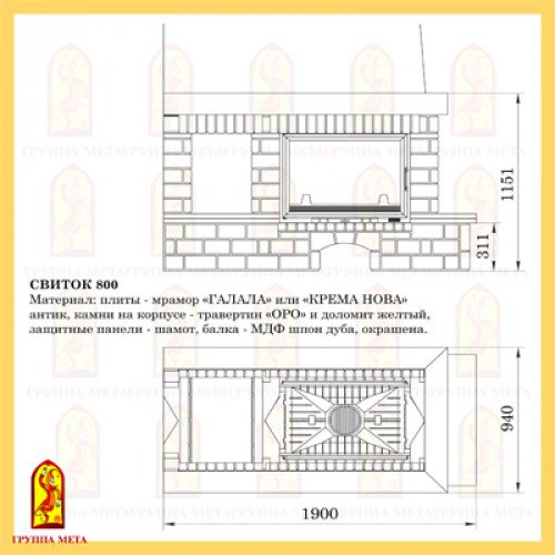 плиты - мрамор "ГАЛАЛА" или "КРЕМА НОВА" (Антик), камни на корпусе - травертин "ОРО" и доломит желтый, защитные панели-шамот, балка - МДФ шпон дуба, окрашена.