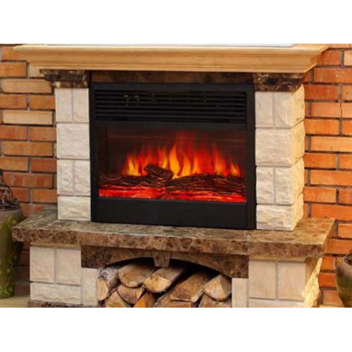 Облицовка из натурального камня. Полированные элементы - мрамор Rossa Verona, колотые элементы - кремово-желтый песчаник. Балка из дуба. Вариант прямой. Подходящие топки: электроочаг.