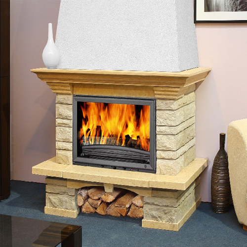 Облицовка из натурального камня. Полированные элементы - мрамор Giallo, колотые элементы - кремово-желтый песчаник. Балка из дуба. Вариант прямой и угловой. Подходящие топки 700 серии с прямым стеклом.
