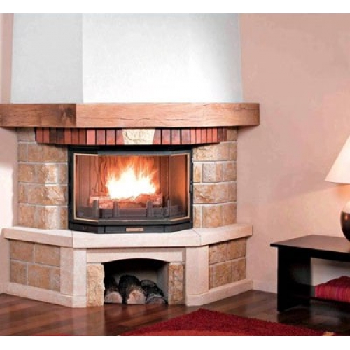 Угловой камин Axis Se Monosque из камня Dordogne, Pierre marbriere, балка массив дуба. Pierre marbriere preassemblee + Dordogne + bricks brun/rouge + chene.