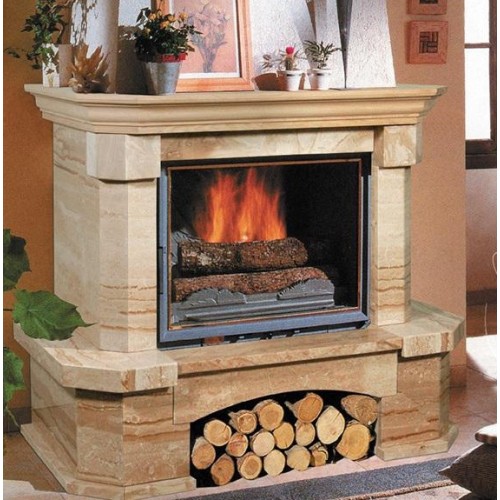Облицовка изготовлена в Италии и отличается неповторимым дизайном. Она изготовлена из полированного мрамора Dayno Reale. Камин имеет традиционную форму. Боковые части конструкции украшены декоративными колоннами. Верхняя часть модели увенчана декоративной балкой в виде полки. По обе стороны облицовки расположены небольшие столешницы. В нижней части расположена вместительная дровница. Сюда можно поместить суточный запас поленьев.