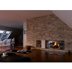Дровяной камин с рельефной облицовкой из камня Doura с открытым огнем. Внутренние стенки очага выложены красным кирпичом, белые швы. Открытый огонь: 80 x 64 см.