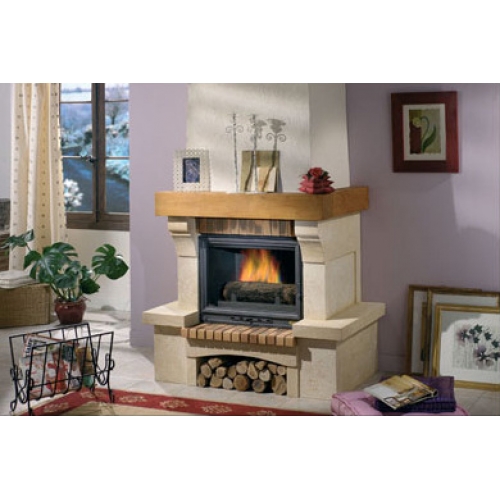 Пристенный камин с облицовкой из камня Mauzens. Плита перед топкой выложена огнеупорным обожжённым кирпичом шириной 5 см. Декоративная балка изготовлена из массива дуба. Внизу расположен вместительный отсек для дров.