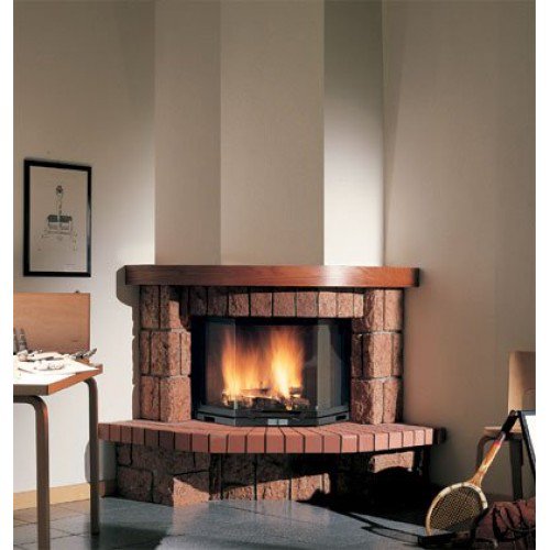 От этого углового камина в стиле кантри так и веет теплом и уютом. Выполненный из кусочков мрамора Rosso Asiago грубой обработки, он смотрится очень необычно. Эта модель традиционно декорирована массивной деревянной балкой и оснащена столешницей из обоженного кирпича.