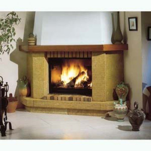 Угловой камин серии Stylo из Гарского камня. Плита и консоль из огнеупорного кирпича толщиной 5 см. Металлическая топка 904, колосник и зольник.