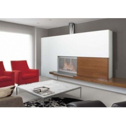 Пристенный камин. Плита и фасад отделаны шпоном вишневого дерева. Горизонтально подвижный защитный экран  модели Swing 90 Intro из матовой нержавеющей стали. Металлическая топка Class 90 с зольником и колосником.