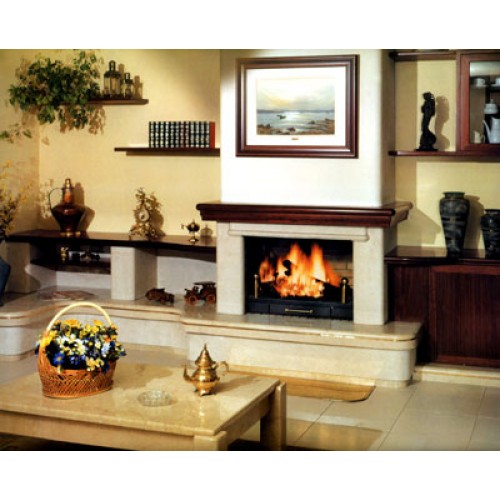 Пристенный камин из бучардированного мрамора Becco.Цоколь и плита из полированного мрамора Crema Benedeta. Деревянная формированная балка. Топка 913 из огнеупорного кирпича.