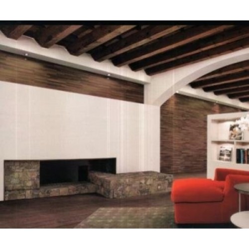 Камин из камней горных пород (боковая стенка, плита и банкетка) со швом. Рамка и консоль из состаренной меди. Топка из огнеупорного 120 кирпича, с раздвижным защитным экраном (направляющая сверху) Swing Vitra с затемненным стеклом.