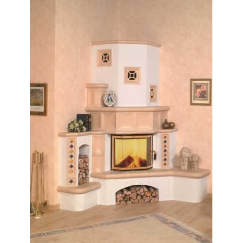 Камин Hark 3/109.4. Угловой камин из изразцов цвета sahara. Банкетка. Прекрасные угловые камины в своеобразном ассиметричном исполнении. Камины имеют также дополнительную дровницу. Облицовка каминов выполнена из изразца "Provence" в глазури "sahara", а также оштукатуренных литых частей из огнеупорного материала. Просторный карниз и полки каминов дают дополнительные возможности для декораций.