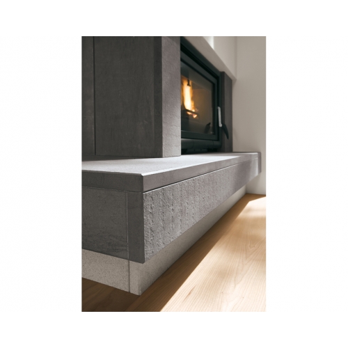 Облицовка Palazzetti Auronzo из обработанного пламенем камня Medea или мрамора Giallo Egizio с обработкой brushed. С постаментом из бучардированного белого камня.
