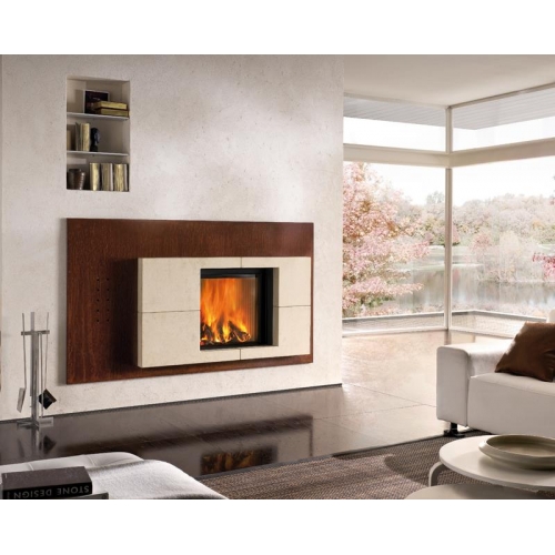 Облицовка из полированного камня Zen, задняя панель из нержавеющей стали с отделкой под ржавчину. Рамка из эмалированной нержавеющей стали черного цвета. На фото представлена модель с дровяной топкой ME 65/60.