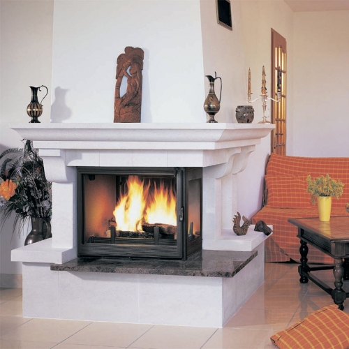 Оригинальная модель дровяного камина-выступ. Камин выполнен из белого камня Blanche, под топкой расположена большая плита из гранита Royal. Чугунная топка с двухсторонним термостойким стеклом.