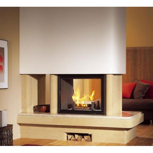 Двусторонний камин из камня Provance и мрамора Crema Marfil.