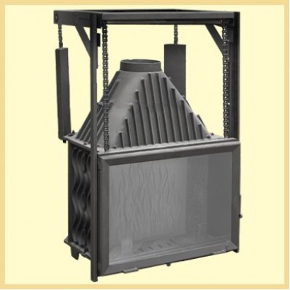 - подъемным механизмом дверцы, который плотно и бесшумно работает, надежно защищая пространство вокруг топки от углей и искр;