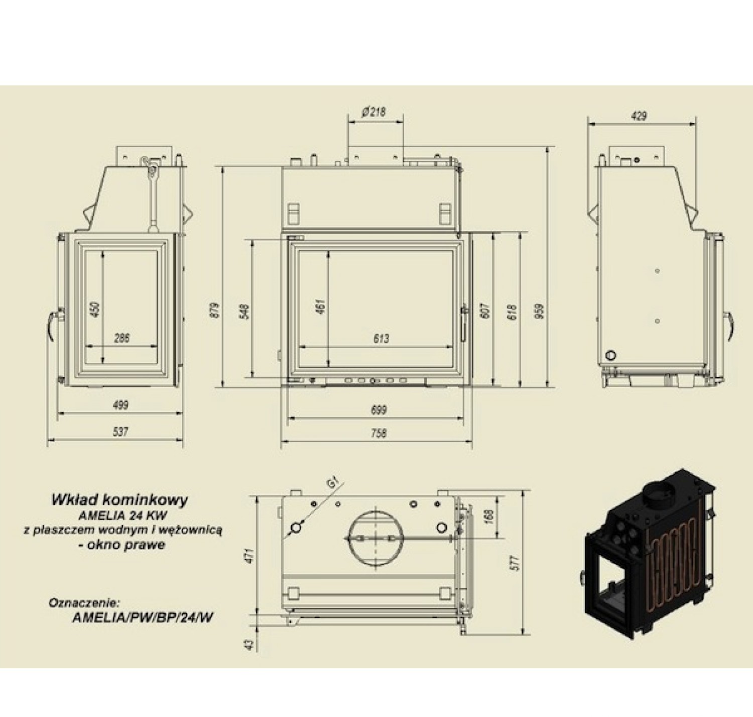 Amelia PW/BP/24/W/Z (стекло справа, змеевик)— топочная камера или топка-вкладыш, предназначена для отопления дома площадью до250 кв.м. Продукция предприятия Kratki имеет множество наград, которые подтверждают высокое качество продукции ииспользование современных технологий. Оптимальное сочетание «цена-качество» делает закрытые очаги Amelia PW/BP/24/W/Z привлекательными для обустройства камина иводяной системы отопления, совмещенной собычным дровяным камином. Особенности оборудования серии Amelia PW/BP/24/W/Z отKRATKI: Топка высокой мощности, предназначена для больших помещений; Дополнительное боковое стекло; Чугунная топка непрерывного сгорания с водяным теплообменником; Мощность теплообменника 24 кВт, объем— 57 литров; Топка с водяным теплообменником изготавливается изнелегированной листовой стали специальных сортов; в камере сгорания расположены дымоградные трубы увеличивающие поверхность теплообмена втопке; Дополнительно предусмотрен медный змеевик; Топливо— сухие дрова длиной до500 мм, уголь вбрикетах; Стекло— термостойкая стеклокерамика, предел нагрева 800 С; Высокий дымосборник, наличие шибера; Полная герметичность дверцы; Топка имеет съемную ручку надверце; Прозрачность стекла обеспечивает система встроенного обдува; Предусмотрен держатель дров— непозволяет рассыпаться при открытии дверцы; Накорпусе топки предусмотрены специальные ручки, предназначенные для удобства транспортировки; Дно топочной камеры имеет отверстие для золы.