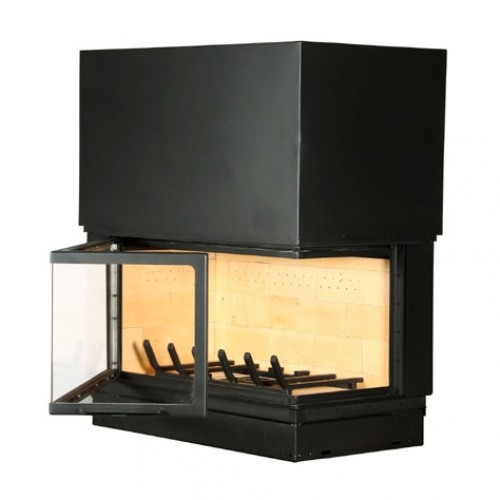 Угловая правая каминная топка со стеклом 16/9. Стекло топки - цельное. Дверцу топки можно открыть вбок за один прием.