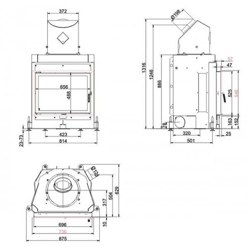 Стальная топка с прямым стеклом. Боковое открывание двери. Ширина дверки 656 мм, высота - 488 мм. Возможно подключение воздуха из-вне.