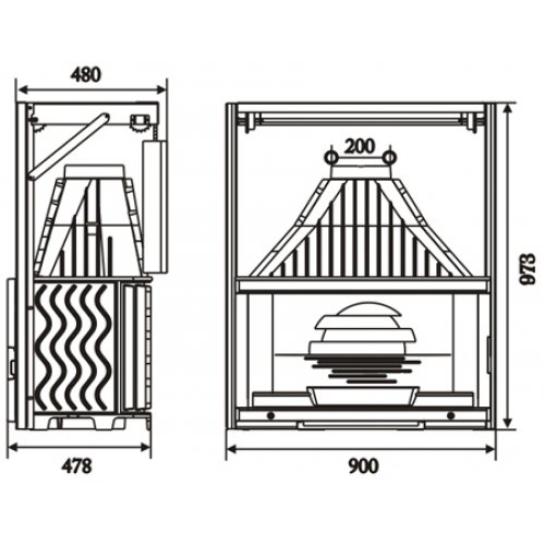 - удобный подъемный запорный механизм, позволяющий работать камину при полном открытии дверцы. Выпадение углей или поленьев исключено;