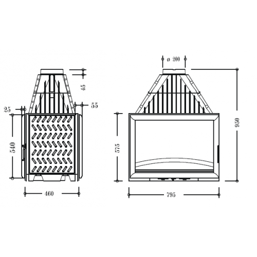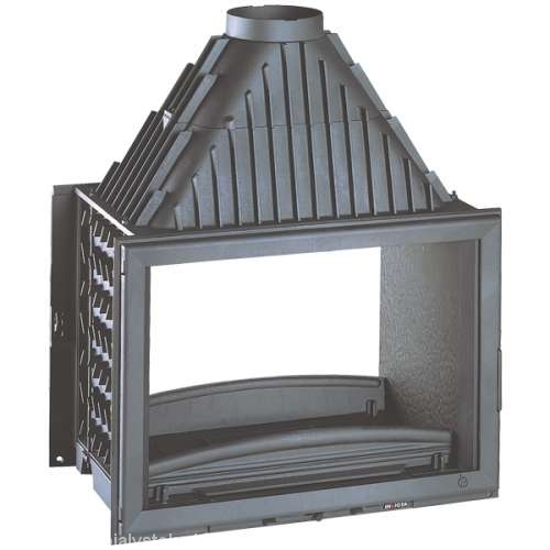 Каминная топка данной модели предназначена для встраивания ее в стену. Она изготовлена из качественного и прочного чугуна. В топке предназначен специальный барьер, который разделяет внешнюю среду от внутренней среды камина. Стекло должно быть прочным и термоустойчивым, чтобы оно не лопнуло и не треснуло от высокой температуры. Такая стеклянная дверь предназначена для защиты пола, ковра, мебели от ненужных повреждений, которые они могут получить от исходящих из камина искр. А стекло предотвращает это. Также через него можно наблюдать непосредственно процесс горения камина.