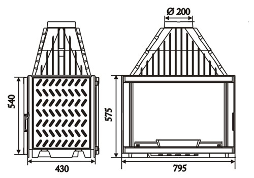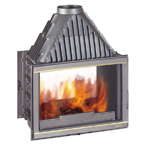 Чугунная двухсторонняя топка с увеличенным обзором огня. Увеличенный дымосборник, боковое открывание дверей.