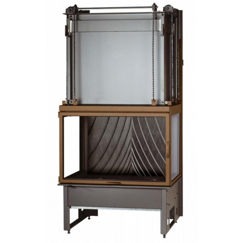 Каминная топка, выполненная из стали. Задняя стенка из толстого чугуна. Трехсторонний обзор огня. Прямое керамическое стекло, устойчивое к высокой температуре. Дверца открывается вверх при помощи подъемного механизма.