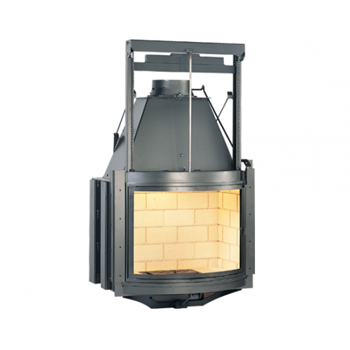 Горизонтальная топка с подъемным механизмом двери. Благодаря большой мощности, такая топка способна отапливать большие помещения и сохранять тепло на протяжении длительного времени. Стенки очага защищены шамотом. Дверь с прямым керамическим стеклом, устойчивым к высоким температурам.