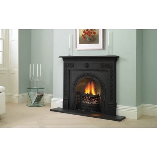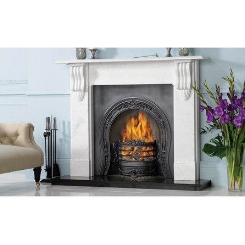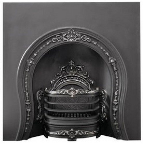 Horseshoe - открытая чугунная каминная топка в английском стиле. Расположение топки фронтальное. Компактная каминная топка из чугуна со скошенными стенками изготовлена по старинным технологиям. Она украшена литым чугунным рельефом. Данная топка может быть полированная либо черная и она может быть декорирована изразцами, расписанными в технике итальянской майолики. . Пол перед камином выложен плиткой и оформлен металлическим бортиком.
