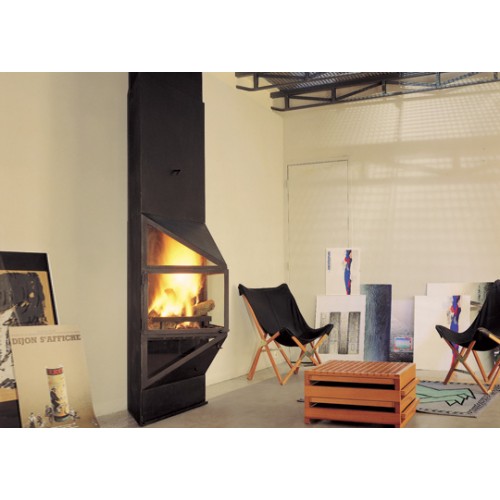 Огонь виден со всех точек, горит как при открытых, так и при закрытых дверцах. Легко устанавливается с телескопическим верхом. Требует для себя маленькой площади пола, возможна установка как в углу, так и к плоской стене – эти качества позволили этой модели завоевать приз прессы на Французской выставке улучшения жилища в Париже.
