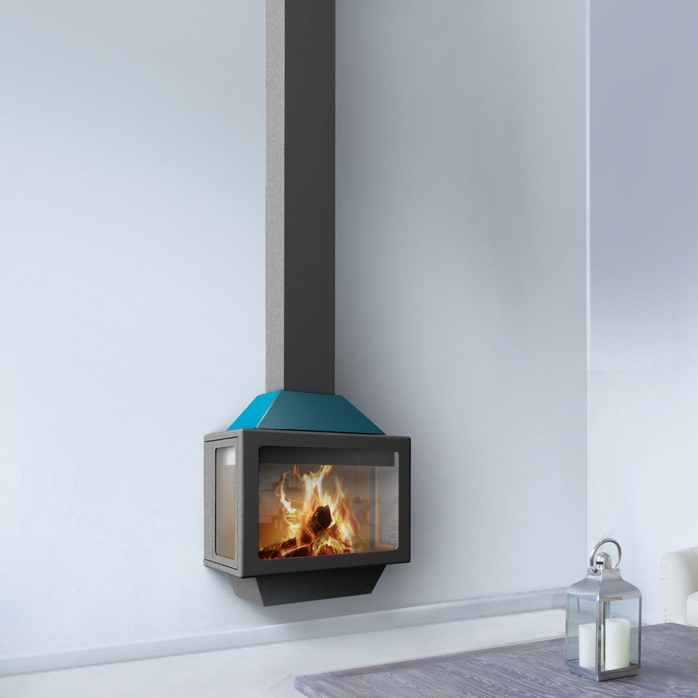Фронтальный подвесной камин со стеклом и двойным верхним кожухом.