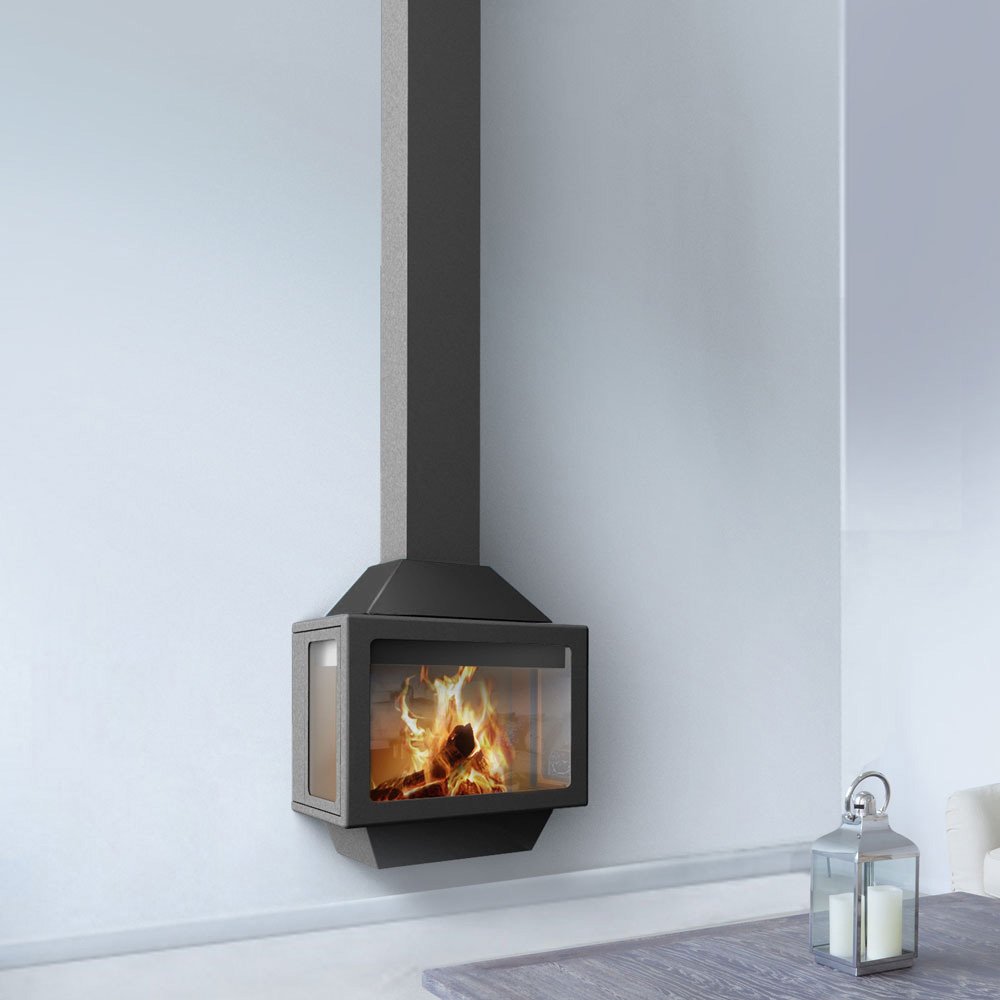 Фронтальный подвесной камин со стеклом и двойным верхним кожухом.