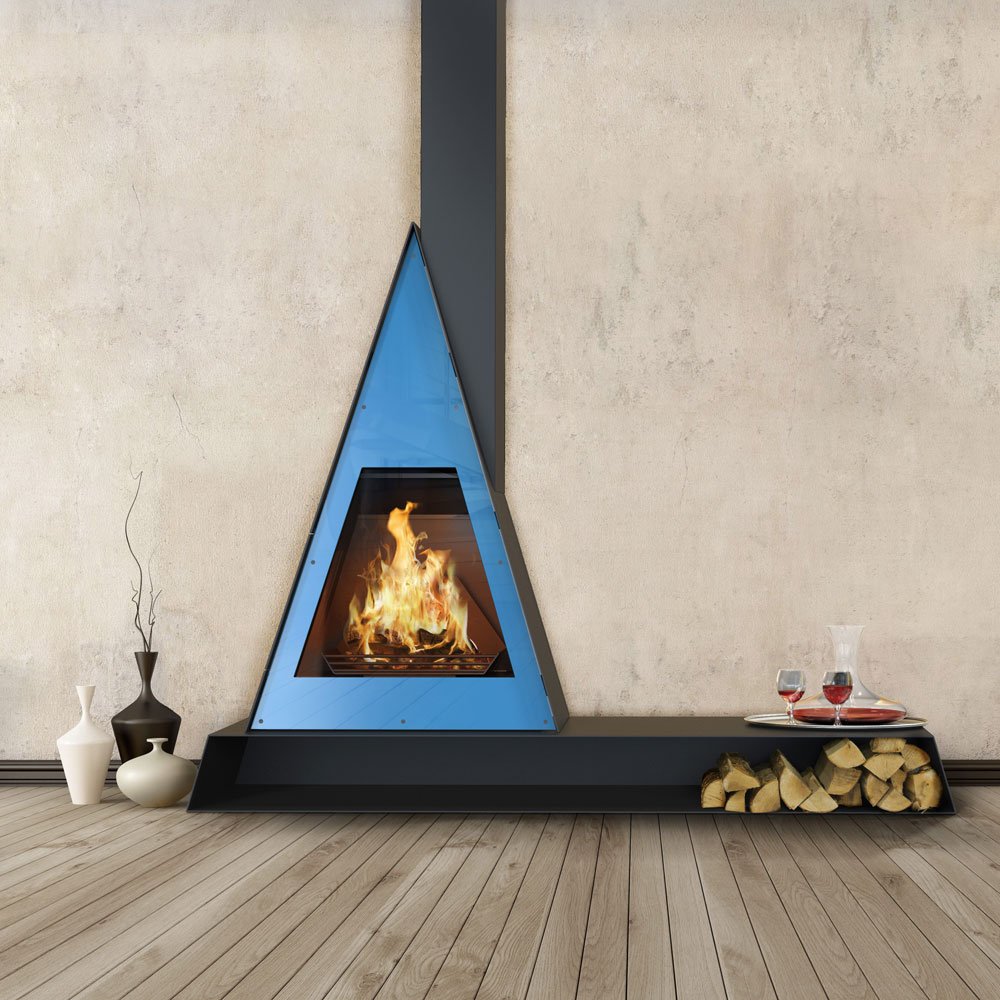 В зависимости от общего оформления интерьера каминной залы, вы можете выбрать наиболее подходящий цвет фронтальной облицовки. Любопытная треугольная форма камина отсылает наблюдателя к конструктивистским стилевым тенденциям прошлого века, получившим новое рождение в современном, а точнее даже футуристическом исполнении.