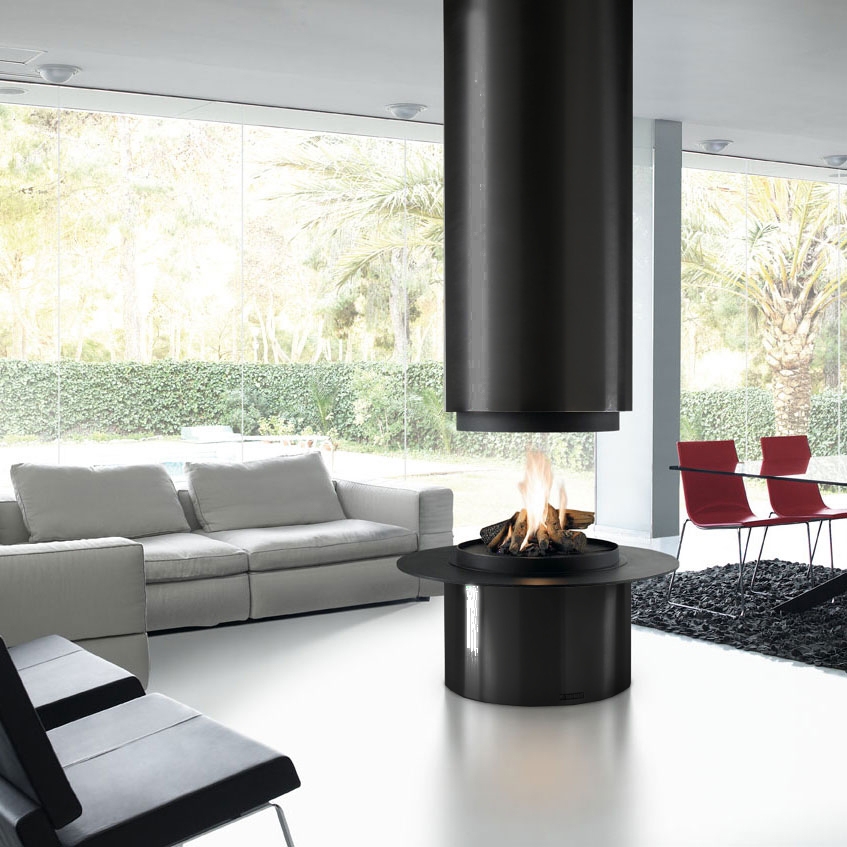 Центральный камин цилиндрической формы, с двойным корпусом. Цвет - черный.