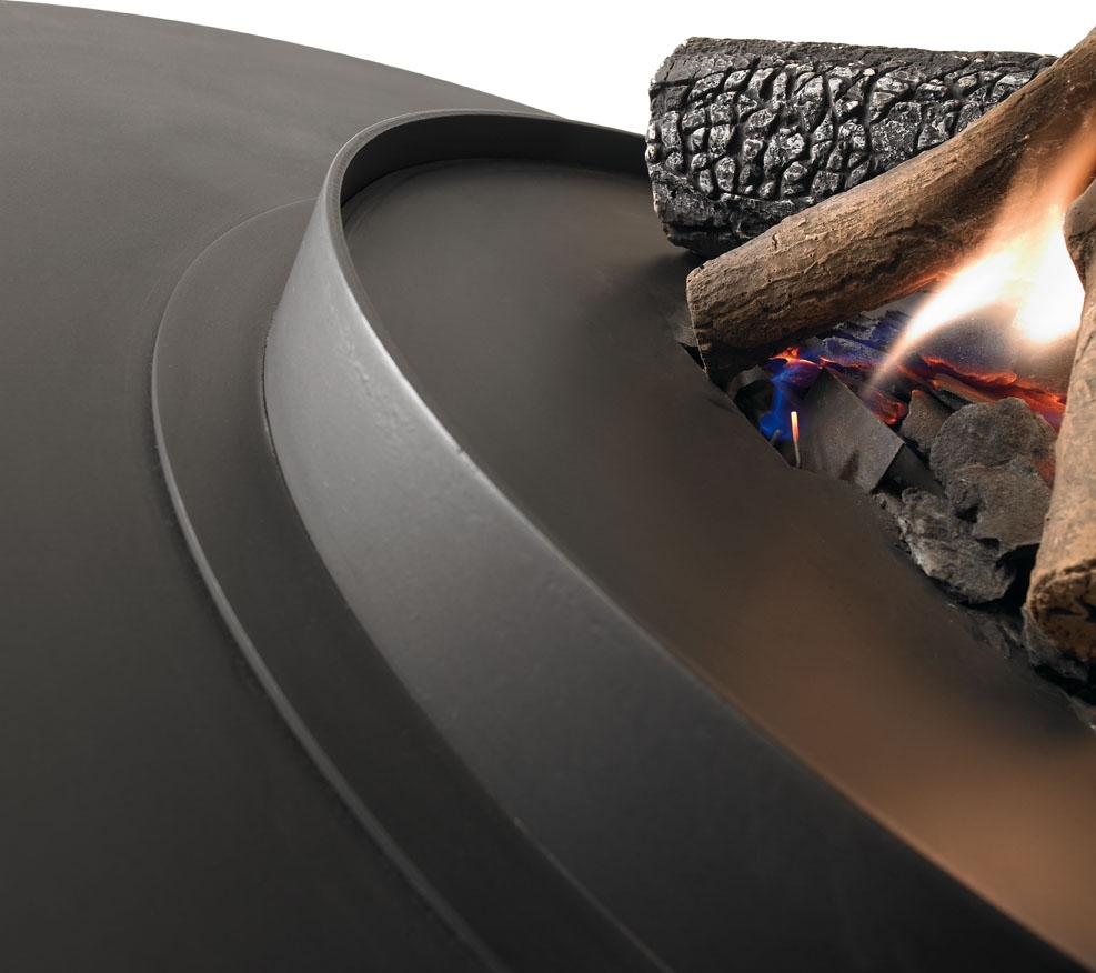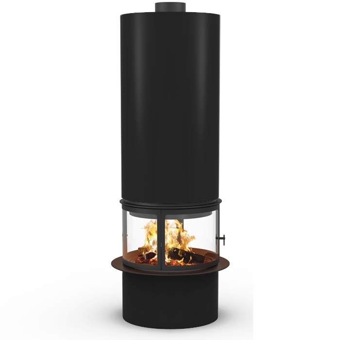 Центральный камин цилиндрической формы, с двойным корпусом. Составное стекло из 4 полукруглых частей. Цвет - черный.