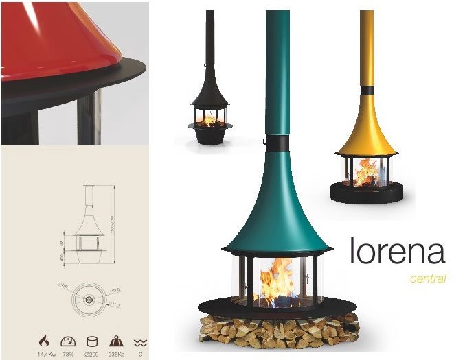 Центральный круглый дровяной камин Lorena центральной конфигурации для создания стильных изысканных интерьеров и оптимального отопления помещений. Компания Traforart, как и обычно, удивляет своих клиентов новаторством конструкторской и дизайнерской мысли. Камин LORENA имеет необычную круглую, немного цилиндрическую, но очень гармоничную и практичную конструкцию, которая чем-то напоминает домашнее барбекю. Длинный элегантный дымоход плавно переходит в верхнюю округлую часть камина. Ниже идет сам очаг – застекленный по всей окружности, с удобными дверцами и просторными стеклами, которые открывают потрясающий вид на игру пламени с любой стороны. Заключительная нижняя часть, аналогичная по форме с верхним и топочным элементом камина, имеет удобную выступающую полку по всей окружности, которая выполняет как декоративные, так и практичные функции. Также вы можете выбрать цвет облицовки камина – черный, серый, фиолетовый, красный, желтый, зеленый, синий и любой другой.