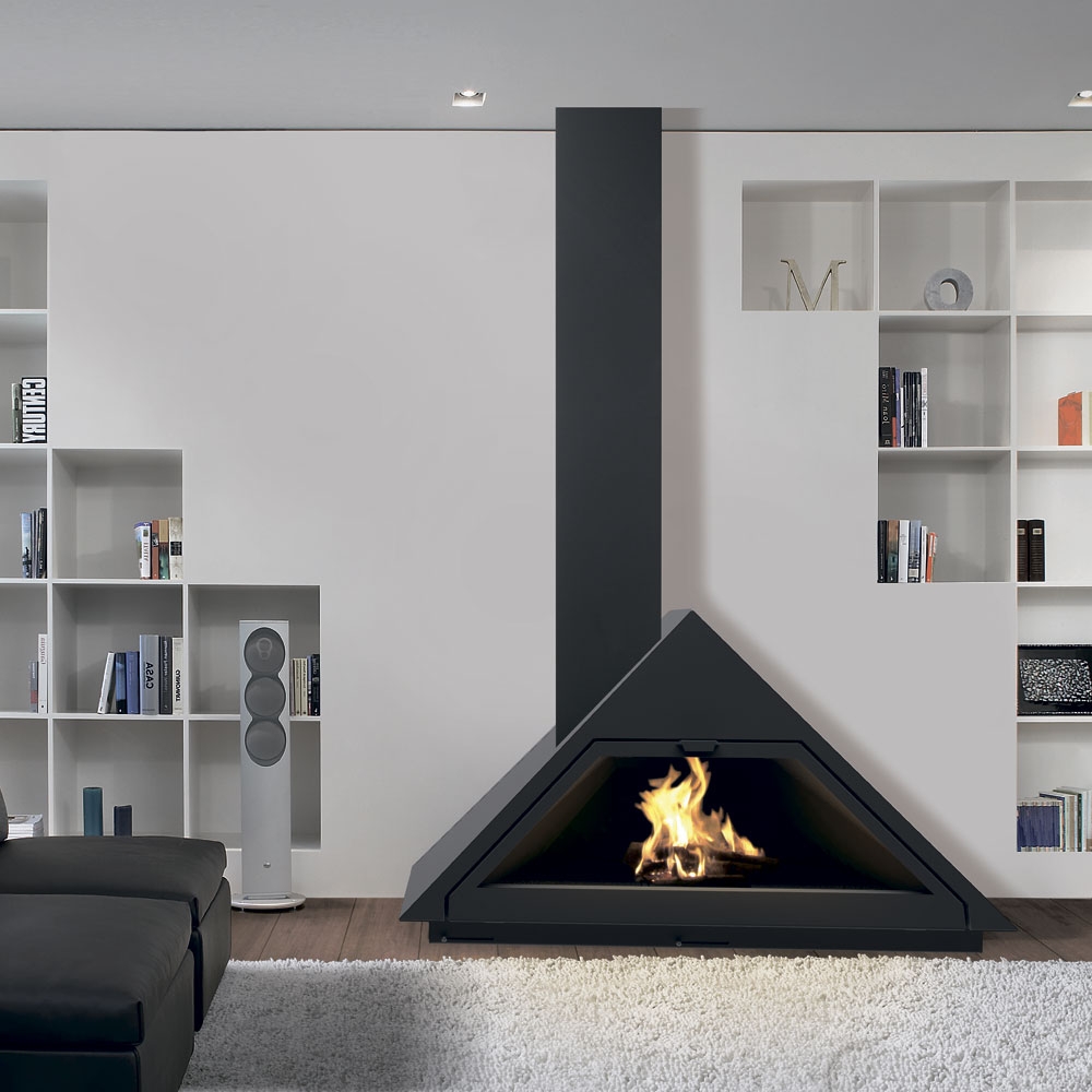 Фронтальный камин со стеклом. Вертикальная труба слева. Камин изготовлен из особой стали. Отделан огнеупорной черной краской, которая выдерживает температуру 650º.