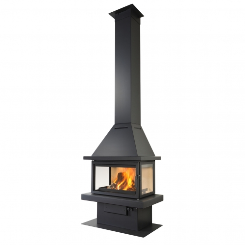 Отопительный камин для пристенного монтажа. Такой камин займет достойное место в загородном доме. Дополнительные боковые стекла значительно увеличивает вид на огонь. Внутренние стенки очага облицованы огнепрочным материалом. Система самоочистки стекла. Экономичный расход дров - одной закладки дров хватает на несколько часов непрерывного горения.