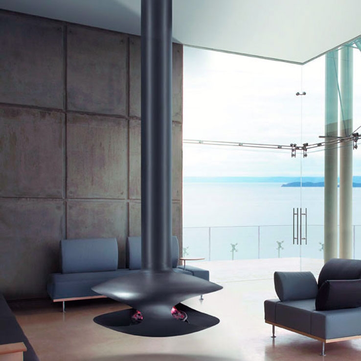 Центральный металличесий камин, открытый по бокам. Колосник и зольник встроены в основание. Высота камина 2,60 м, крепеж вплотную к потолку, механизм межбалочного крепления.