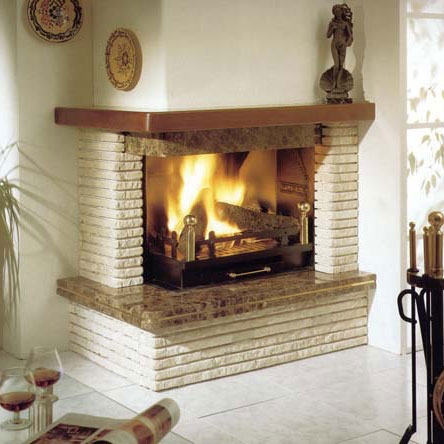 Угловой камин из Crema, кладка лозете. Плита и консоль из полированного мрамора Emperador. Металлическая топка 070, открытая сбоку с колосником и зольником.