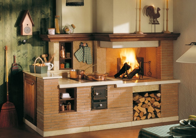 Пристенно-угловой камин из кирпичей, обработанных вручную. Столешница из полированного мрамора Giallo dIstria. Дровяная печь из стали и чугуна. Правый угол.