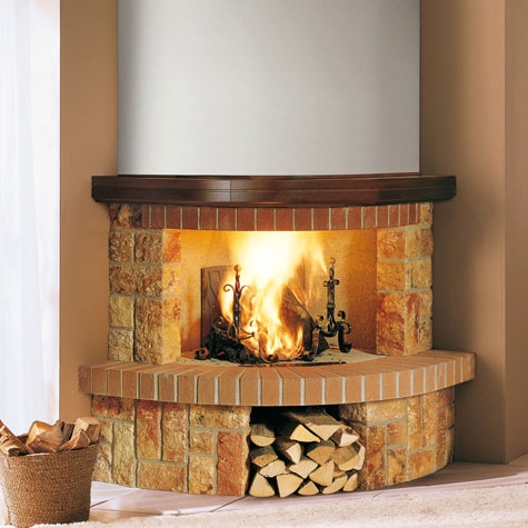 Угловой камин из мрамора Soleado. Столешница из шамотного кирпича. Каминная полка под орех.