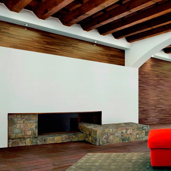 Камин из камней горных пород (боковая стенка, плита и банкетка) со швом. Рамка и консоль из состаренной меди. Топка из огнеупорного 120 кирпича, с раздвижным защитным экраном (направляющая сверху) Swing Vitra с затемненным стеклом.