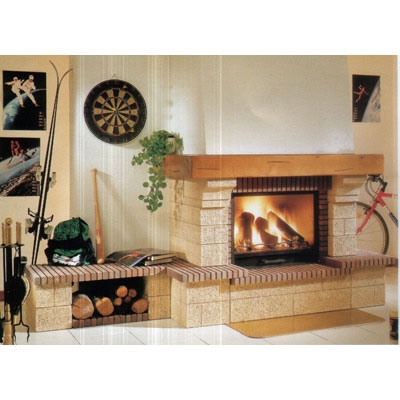 Фронтальный камин из Гарского камня с плитой и консолью из огнеупорного кирпича толщиной 3 см. Деревянная балка из Iroko. Металлическая топка 904 с колосником и зольником.