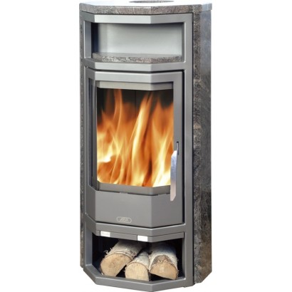 Топка этой печи изготовлена из стали, оснащена стеклокерамическим стеклом, выдерживающим температуру нагрева в 700 градусов С. Предусмотрена система двойного дожига, функция медленного горения и система «чистое стекло». Под топкой печи расположена удобная ниша для хранения дров, а в верхней части камина расположена ниша для разогрева пищи.