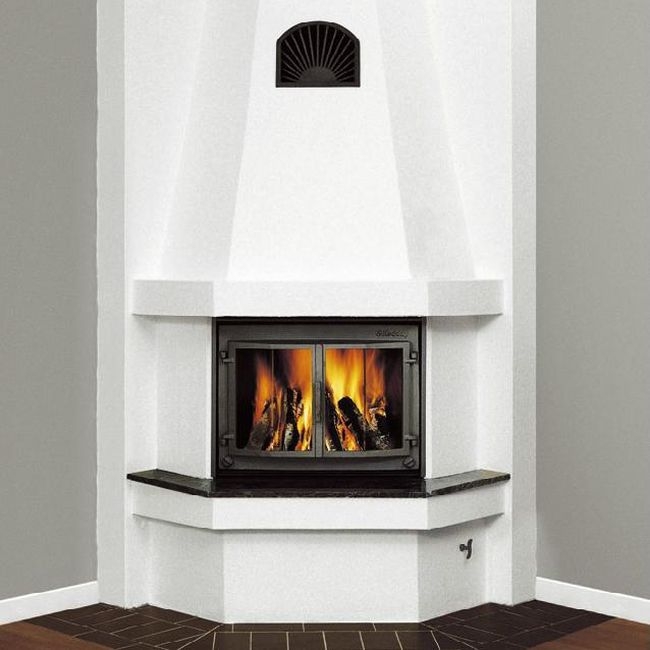 С призматическим стеклом в дверцах, Mistral создает уют открытого очага. В то же время это очень эффективный источник тепла. У Mistral большая чугунная топка, вмещающая много дров. Темный цвет чугунных элементов красиво контрастирует с белой поверхностью облицовки. Хотя Вы можете сами выбрать отделку поверхности, боле тонкую или грубую штукатурку, а затем покрасить в любой цвет по своему выбору.